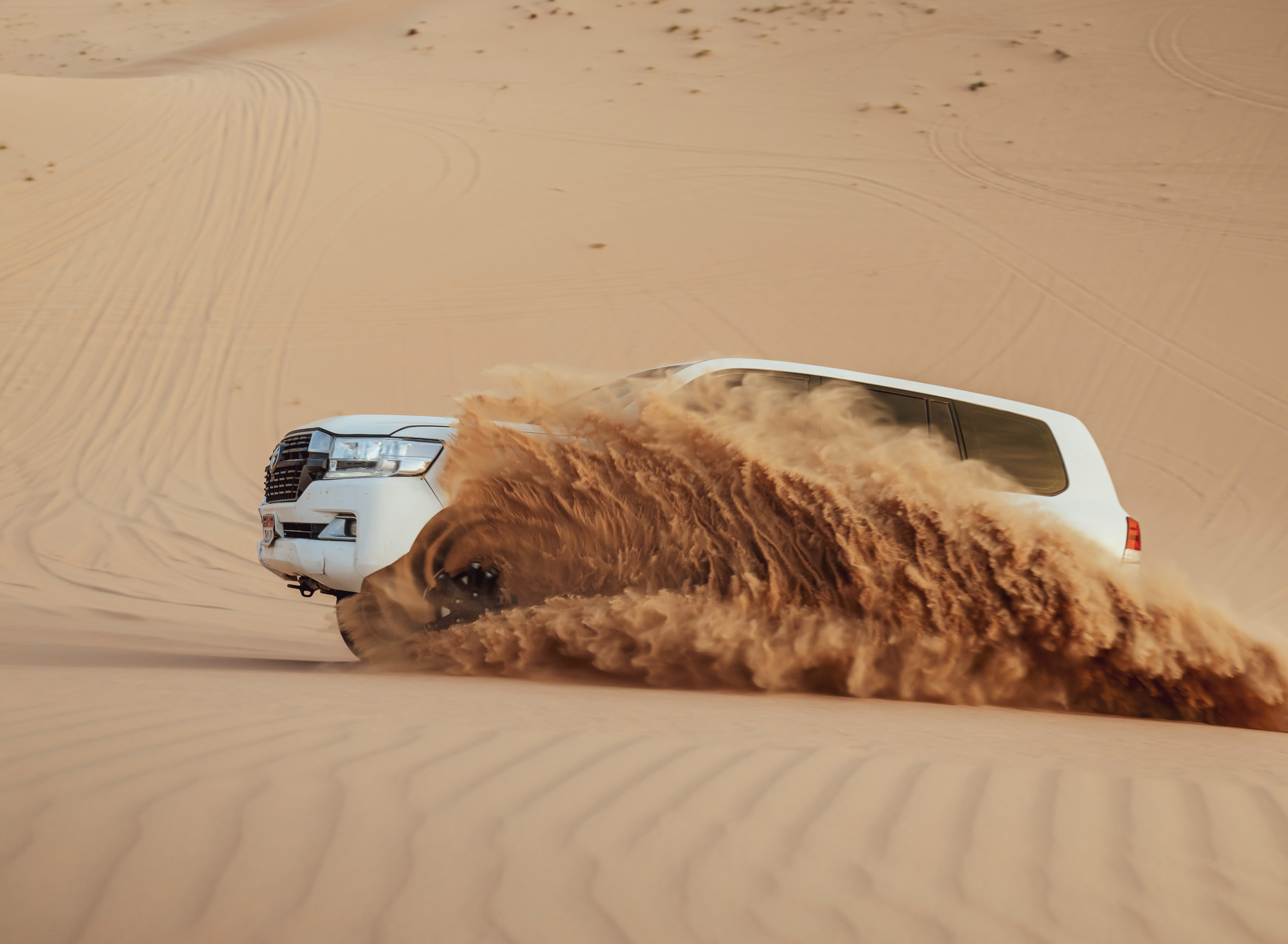 Dune Bashing - Hold on tight as our skilled drivers take you on an exhilarating ride over the rolling sand dunes in a 4x4 vehicle.